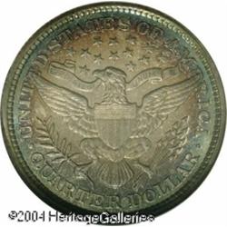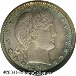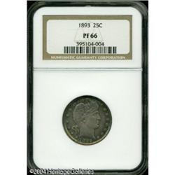 1893 25C PR66 NGC. Variegated shades of rose-gray <B>1893 25C PR66 NGC.</B></I> Variegated shades of rose-gray toning dominate this coin's central appearance with turquoise-blue at the peripheries. A cornucopia of rainbow undertones is visible at select angles. The razor sharp strike confirms this coin's proof status. Problem-free and original, the surfaces are suggestive of an even more desirable grade. Population: 50 in 66, 34 finer (10/04). <BR><BR><B>Important notice:</B> Heritage usually auctions material at the rate of 200-250 lots per hour. On some occasions eBay Live bid software or the Internet may not be able to keep up with the pace of the auction. We recommend placing a realistic absentee bid now as insurance to avoid disappointment. Occasionally the auctioneer may eliminate or reject an eBay Live bid, and the auctioneer may also reopen a lot after the close of the eBay live bidding (usually because we missed an audience bid), and may reject your bid even if it shows you as the winning bidder. By bidding via eBay Live, you agree that Heritage may award the lot to another bidder at its sole discretion under the circumstances described above or any other reasonable circumstances. Since eBay bids are not shown to us until we open the lot on the floor, we treat those bids just like floor bids. In most cases the floor responds before the eBay bid is presented to us, due to Internet lag time, so for consistency we have made it a policy that floor bids are always considered first over tie eBay live bids. Also please note that all Heritage lots purchased through eBay Live carry a 20% Buyer's Premium. Please make sure you read the Terms and Conditions before you bid. This lot is being auctioned in conjunction with a live floor auction by Heritage Galleries & Auctioneers. All final auction and invoice information will be supplied by Heritage Galleries & Auctioneers, and all other information should be considered preliminary. Lot:5920