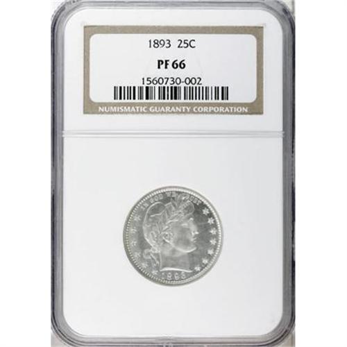 <B>1893 25C PR66 NGC.</B></I> Both sides of this slightly hazy silver piece show elements of contrast, though neither side quite qualifies for a Cameo designation. Excellent quality for this second-year issue. Census: 52 in 66, 36 finer (1/08).<BR><BR><B>Coin Engraver:</B> Charles E. Barber<BR><BR><b>Shipping:</b> Coins & Currency (<a target="_blank" href="http://www.heritageauctions.com/common/shipping.php">view shipping information</a>)