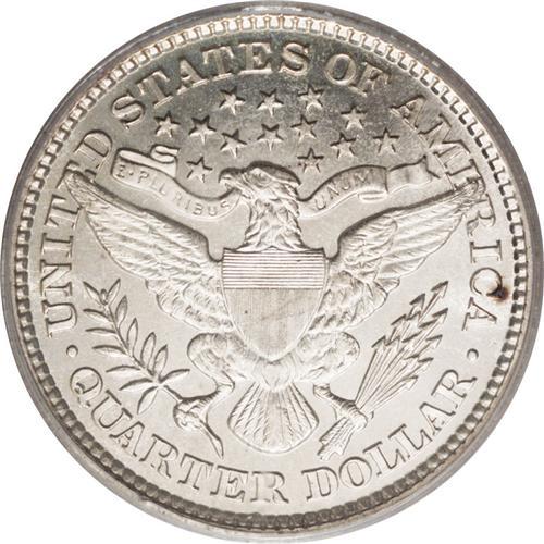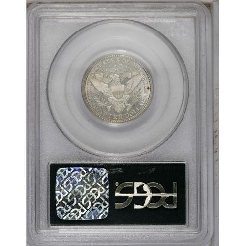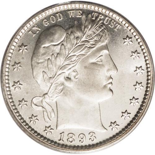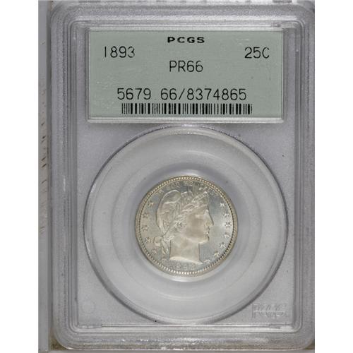 <B>1893<25C> PR66 PCGS.</B></I> Bountiful mint frost shimmers over each side of this stunning proof specimen. This coin's impeccable technical quality includes razor-sharp striking details and impeccable preservation. The surfaces are free of all but the tiniest blemishes, and the fields boast deep reflectivity. A small red-brown spot is noted near the reverse rim, over the top of the C in AMERICA.