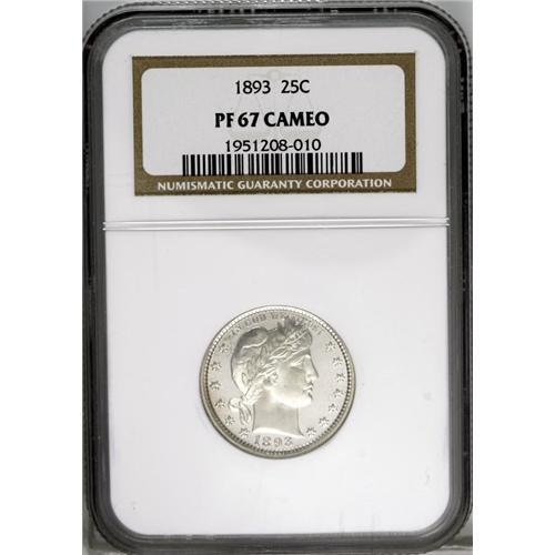 <B>1893<25C> PR67 Cameo NGC.</B></I> Only 792 proofs were produced in 1893, quite a fall from the substantial mintage of 1,245 pieces struck in the previous (and first) year. This is a stunning coin that is brilliant throughout. The devices are heavily frosted and contrast sharply against the unfathomable depth of mirrored reflectivity seen in the fields. Very nearly perfect from a technical standpoint as well as possessing strong eye appeal. One tiny lintmark is noted on Liberty's chin. Census: 11 in 67, 5 finer (3/06).