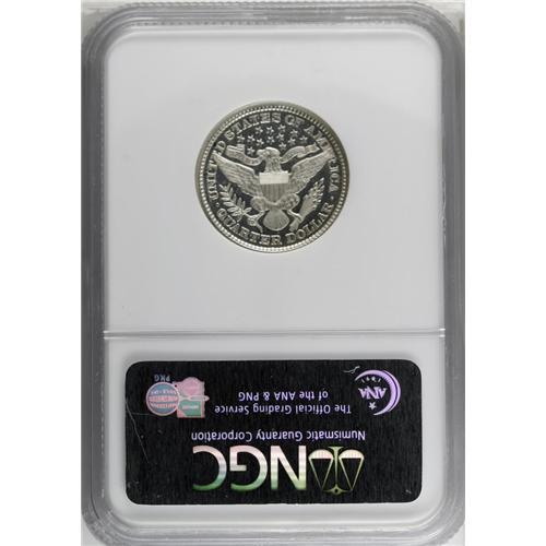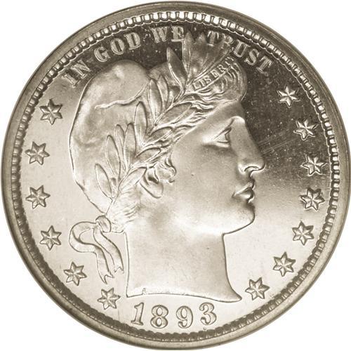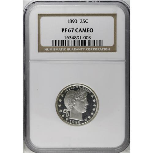 <B>1893<25C> PR67 Cameo NGC.</B></I> Thick frost dominates the devices and suggests Ultra Cameo contrast, although NGC has not designated this prize as such. The strike is pinpoint-sharp, and the fields appear devoid of contact or hairlines. The proof mintage was much lower than the introductory 1892 issue, perhaps partly due to competition with the 1893 Isabella quarter. Census: 10 in 67 Cameo, 7 finer (6/06).<BR><I>From The Mulholland Collection.</B></I>