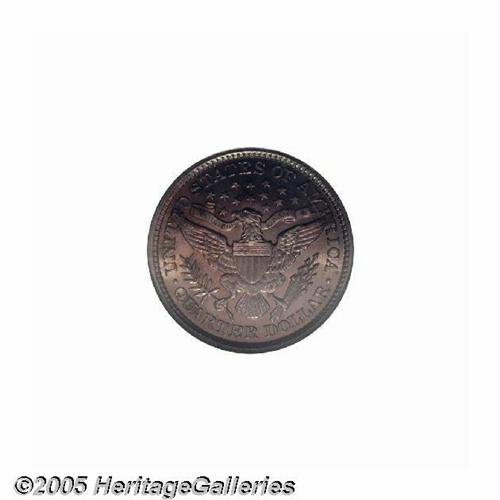 <B>1893<25C> PR67 NGC.</B></I> A near-flawless proof, the obverse is lavishly toned in dappled shades of electric-green, russet, and golden-yellow, while the reverse has deep, even purple-violet toning over that entire side. At the pinnacle of perfection, this coin exhibits unsurpassable quality in this popular first year of issue.