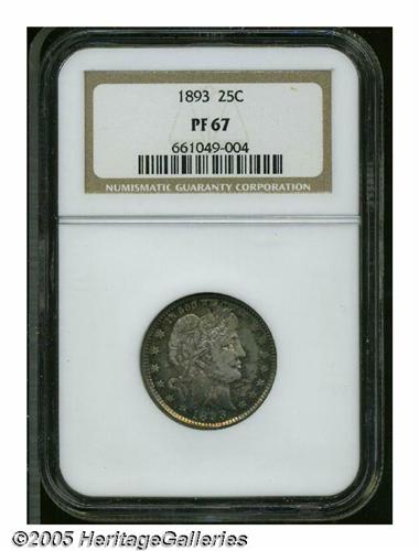 1893 25C PR67 NGC. A near-flawless proof, the obv