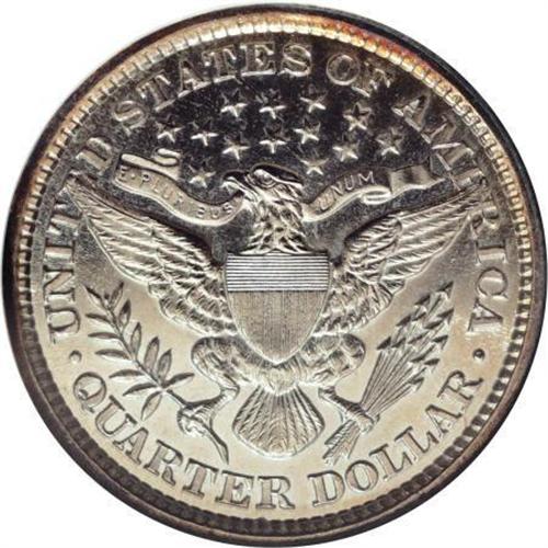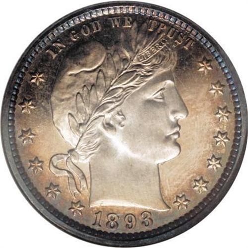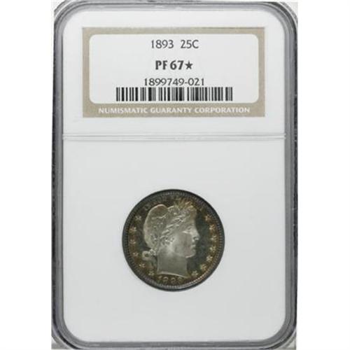 <B>1893 25C PR67 </B></I><img src="/images/star.gif" width="10" height="10" alt="" border="0"><B> NGC.</B></I> This date seems to have been preserved in relatively large numbers for a second-year issue. The devices show a remarkable amount of frost on each side, almost enough to warrant a Cameo designation, and the fields are deeply reflective. The reverse is untoned, but the obverse is richly toned in golden and blue rings that surround the brilliant center. This is the only PR67 <img src="/images/star.gif" width="10" height="10" alt="" border="0"> certified by NGC with three finer according to the November Census Report.<BR><BR><B>Coin Engraver:</B> Charles E. Barber<BR><BR><b>Shipping:</b> Coins & Currency (<a target="_blank" href="http://www.heritageauctions.com/common/shipping.php">view shipping information</a>)