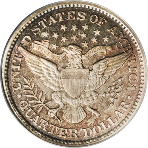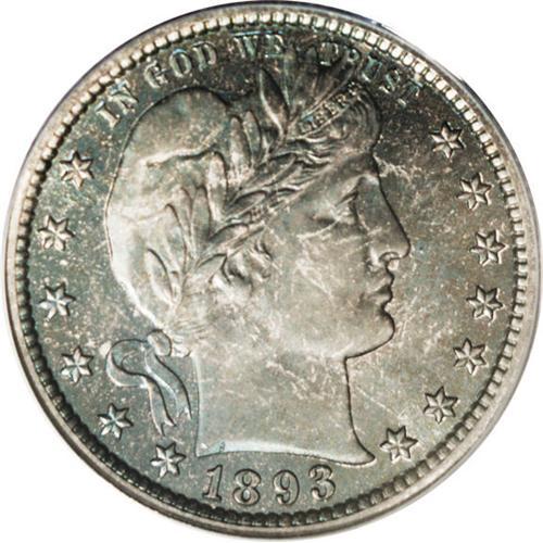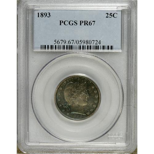 <B>1893 25C PR67 PCGS.</B></I> An exactingly struck example of this early proof Barber issue, moderately reflective beneath rich, colorful patina. The obverse is primarily lavender-gold with a crescent of electric blue at lower left, while the reverse sports vivid sunset-orange in the center and a thin band of rose-violet near the rim. Population: 16 in 67, 3 finer (1/07).<BR><BR><b>Shipping:</b> Coins & Currency (<a target="_blank" href="http://www.heritageauctions.com/common/shipping.php">view shipping information</a>)