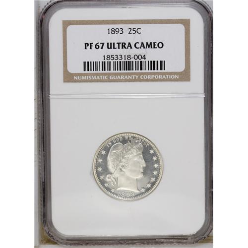 <B>1893 25C PR67 Ultra Cameo NGC.</B></I> This is a special coin that grabs the viewer immediately with the intensity of its white-on-black contrast. Razor-sharp striking details and immaculate surfaces allow the PR67 grade assessment. A tiny lintmark (as struck) is noted directly adjacent to Liberty's earlobe, and would serve admirably as a future pedigree marker. Census: 4 in 67 Ultra Cameo, 1 finer (11/06).<BR><BR><b>Shipping:</b> Coin/Currency (<a target="_blank" href="http://www.heritageauctions.com/common/shipping.php">view shipping information</a>)