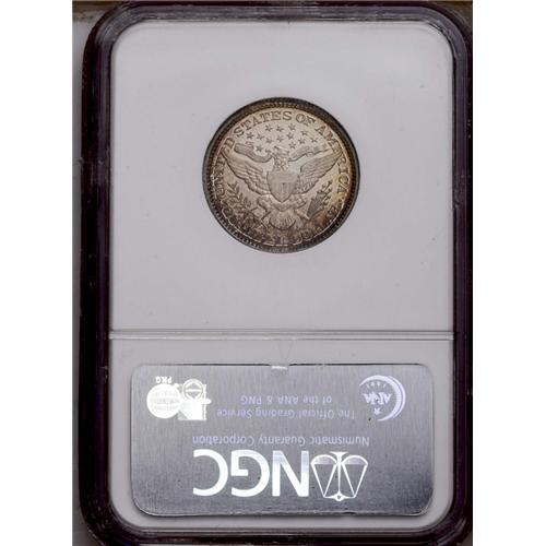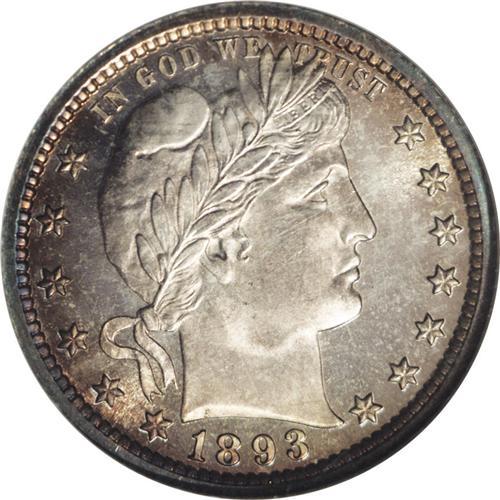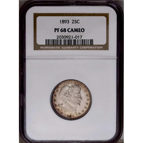 <B>1893<25C> PR68 Cameo NGC.</B></I> Only 792 proofs were produced in 1893, quite a fall from the substantial mintage of 1,245 pieces struck in the previous (and first) year. Beautiful golden-brown and apricot colors invigorate the peripheries, while the suitably frosty devices are generally untoned. A sharply struck and well preserved specimen. A faint handling mark on the chin is of little consequence. This is a most stunning Barber quarter. Population: 7 in 68, 0 finer (4/06).