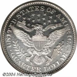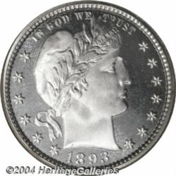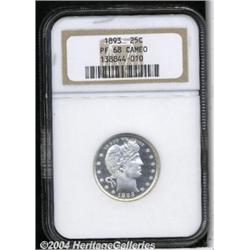 <B>1893<25C> PR68 Cameo NGC.</B></I> The frosty devices offer obvious frosty contrast with the deeply mirrored fields. This fully struck Superb Gem has a seemingly pristine obverse, and the reverse is nearly as well preserved. Both sides present essentially as completely untoned, although the reverse field has just a hint of pale lemon color. The production of proofs fell substantially from the 1,245 pieces struck in 1892, the first year of the series. Apparently, collector interest in the new design was subdued by 1893, as only 792 pieces were issued. Simply stunning quality and eye appeal for a proof Barber Quarter. Population: 6 in 68, none finer (6/04). <BR><I>From the JFS Collection.</B></I> <BR><BR><B>Important notice:</B> Heritage usually auctions material at the rate of 200-250 lots per hour. On some occasions eBay Live bid software or the Internet may not be able to keep up with the pace of the auction. We recommend placing a realistic absentee bid now as insurance to avoid disappointment. Occasionally the auctioneer may eliminate or reject an eBay Live bid, and the auctioneer may also reopen a lot after the close of the eBay live bidding (usually because we missed an audience bid), and may reject your bid even if it shows you as the winning bidder. By bidding via eBay Live, you agree that Heritage may award the lot to another bidder at its sole discretion under the circumstances described above or any other reasonable circumstances. Since eBay bids are not shown to us until we open the lot on the floor, we treat those bids just like floor bids. In most cases the floor responds before the eBay bid is presented to us, due to Internet lag time, so for consistency we have made it a policy that floor bids are always considered first over tie eBay live bids. Also please note that all Heritage lots purchased through eBay Live carry a 20% Buyer's Premium. Please make sure you read the Terms and Conditions before you bid. </span></font></tr></table></td></tr></table>