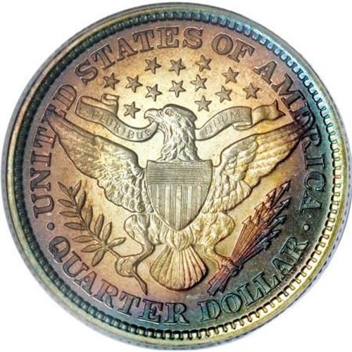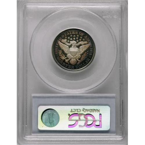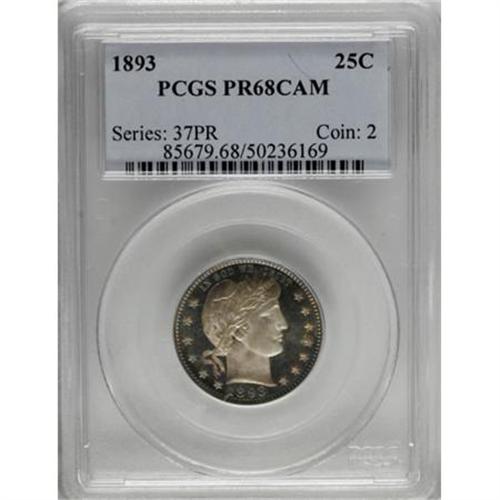 <B>1893 25C PR68 Cameo PCGS.</B></I> The silver centers on each side accent the delicate fuchsia and steel-blue patination along the peripheries, and flashy luster and significant field-device contrast top off the ensemble. Distractions are expectedly absent, and this early-series Superb Gem is one of only three so fine at PCGS, with none finer (7/07). For the entire type, PCGS has certified 18 PR68 Cameo pieces, plus 13 PR68 Deep Cameo coins, and only a solitary PR69 has achieved a higher numerical grade. A fine complement to the similarly toned 1898 PR68 Barber dime in the present sale.<BR><BR><b>Shipping:</b> Coins & Currency (<a target="_blank" href="http://www.heritageauctions.com/common/shipping.php">view shipping information</a>\)
