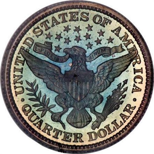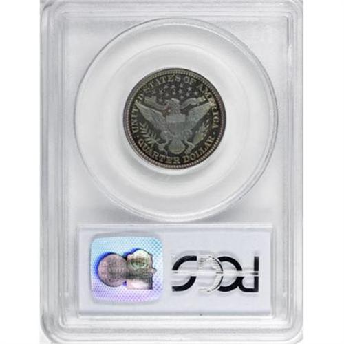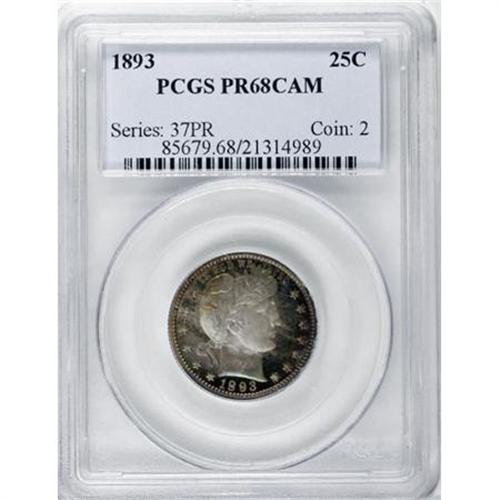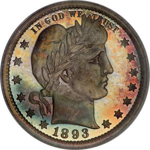 <B>1893 25C PR68 Cameo PCGS.</B></I> From a small but high-quality consignment of high grade proof Barber quarters, this is our favorite. The two-toned cameo contrast on this coin is immediately apparent, even though each side has a significant overlay of toning. The reverse is essentially monochromatic with bright teal covering most of that side and just a light accent of golden-rose around the margin. The obverse, on the other hand, is iridescent in the truest sense of the word; that is, multiple colors are splashed across that side. Rose, yellow, and sea-green are seen primarily in the fields, while the frost on the device of Liberty dominates that side and gives the impression of brilliance in the center. An astonishingly beautiful proof and one of only three so graded by PCGS (11/07). <BR><BR><b>Shipping:</b> Coins & Currency (<a target="_blank" href="http://www.heritageauctions.com/common/shipping.php">view shipping information</a>)