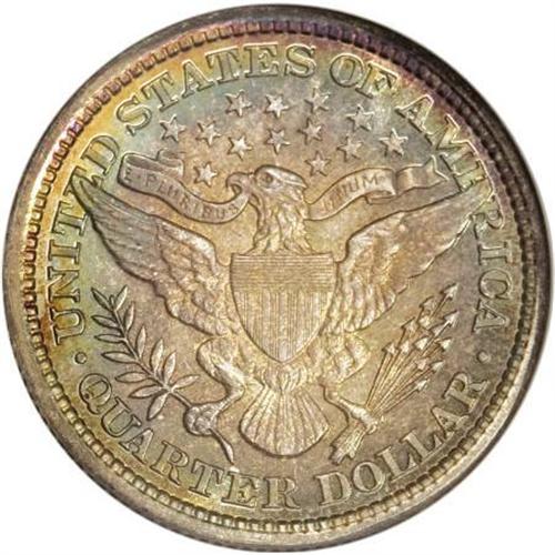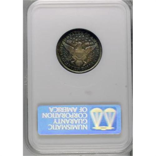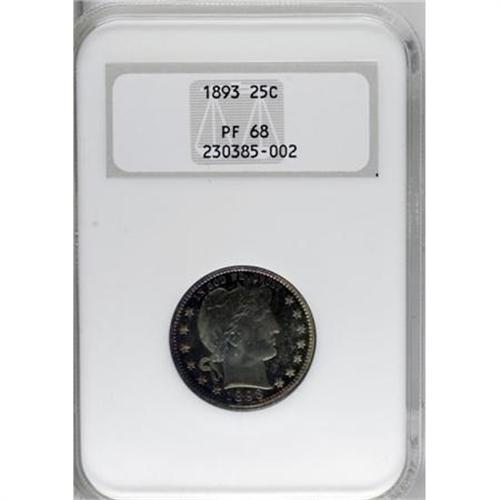 <B>1893 25C PR68 NGC.</B></I> Both sides of this outstanding proof have a thin layer of vibrant, jade, green-gold, amber, and magenta patina that lets the piece's natural reflectivity shine through. The overall level of preservation is astonishing, and even under magnification, the minuscule flaws that keep this proof from perfection are difficult to spot. A decisively struck and exquisite specimen that hails from a mintage of just 792 coins. Census: 12 in 68, 2 finer (6/07).<BR><BR><B>Coin Engraver:</B> Charles E. Barber<BR><BR><b>Shipping:</b> Coins & Currency (<a target="_blank" href="http://www.heritageauctions.com/common/shipping.php">view shipping information</a>\)