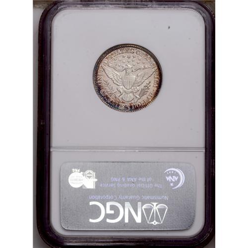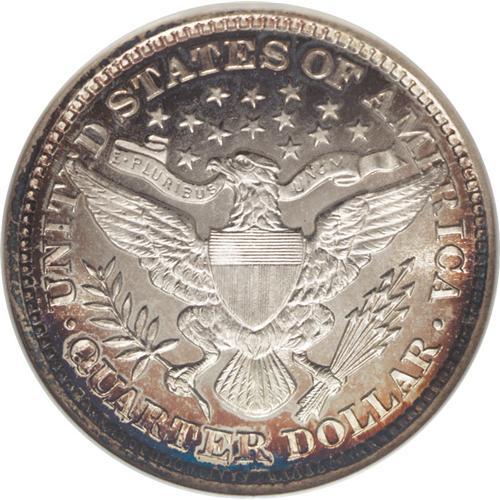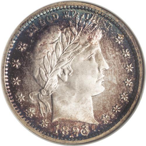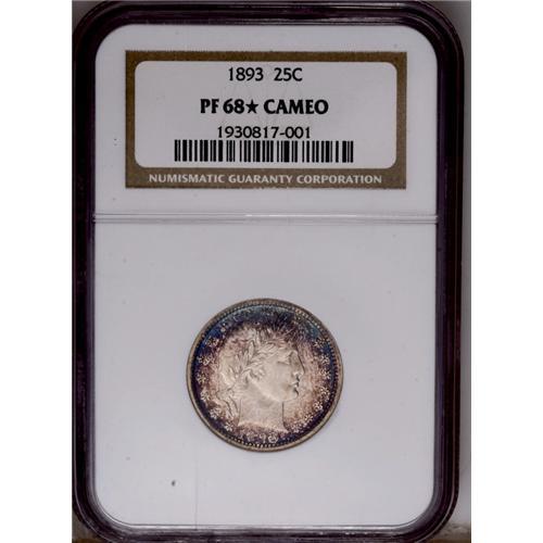<B>1893<25C> PR68 <img border='0' src='http://www.heritagecoins.com/images/star.gif' width=10 height=10> Cameo NGC.</B></I> Cobalt-blue, tawny-gold, and plum colors hug the borders but the centers are mostly brilliant. This pinpoint-sharp second-year Barber quarter is technically flawless, and represents the finest quality practically obtainable, although NGC has certified one other Cameo piece with the Star designation at the PR68 level, and there is also a PR69 <img border='0' src='http://www.heritagecoins.com/images/star.gif' width=10 height=10> (without a Cameo designation), and a PR68 <img border='0' src='http://www.heritagecoins.com/images/star.gif' width=10 height=10> Ultra Cameo that have been graded (3/06). Only 792 proofs were struck.