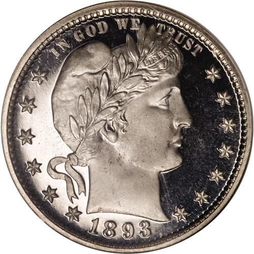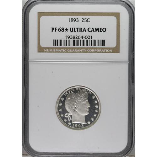 <B>1893 25C PR68 <img border='0' src='http://www.heritagecoins.com/images/star.gif' width=10 height=10> Ultra Cameo NGC.</B></I> The 1893 quarter came with 792 proof strikes, making this issue somewhat common. NGC and PCGS have, to date, certified more than 430 proof examples. The two services have given fewer than 100 specimens the Cameo designation, and a total of 17 coins rated the Ultra/Deep Cameo classification, including a PR65, six PR66s, nine PR67s (of which one was an NGC S), and the solitary PR68 <img border='0' src='http://www.heritagecoins.com/images/star.gif' width=10 height=10> making up this lot (3/07).<BR> White-on-black contrast immediately grabs the viewer's attention, and the heavily frosted motifs appear to glide over the deep watery fields when the piece is rotated beneath a light source. A powerful strike emboldens the design features, leaving no areas with even a hint of softness. Immaculately preserved, completely untoned surfaces round out this coin's fantastic eye appeal.<BR><BR><b>Shipping:</b> Coins & Currency (<a target="_blank" href="http://www.heritageauctions.com/common/shipping.php">view shipping information</a>)