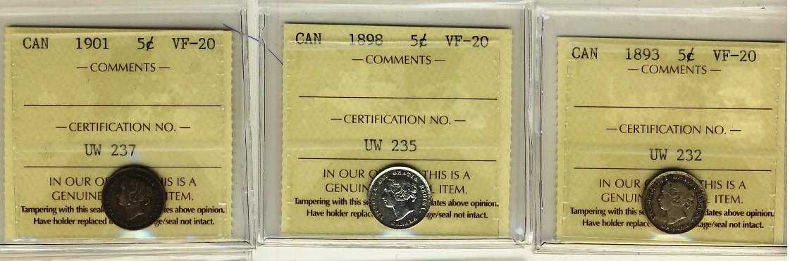 1893 5¢, 1898 & 1901 ICCS VF20. Lot of 3 coins.