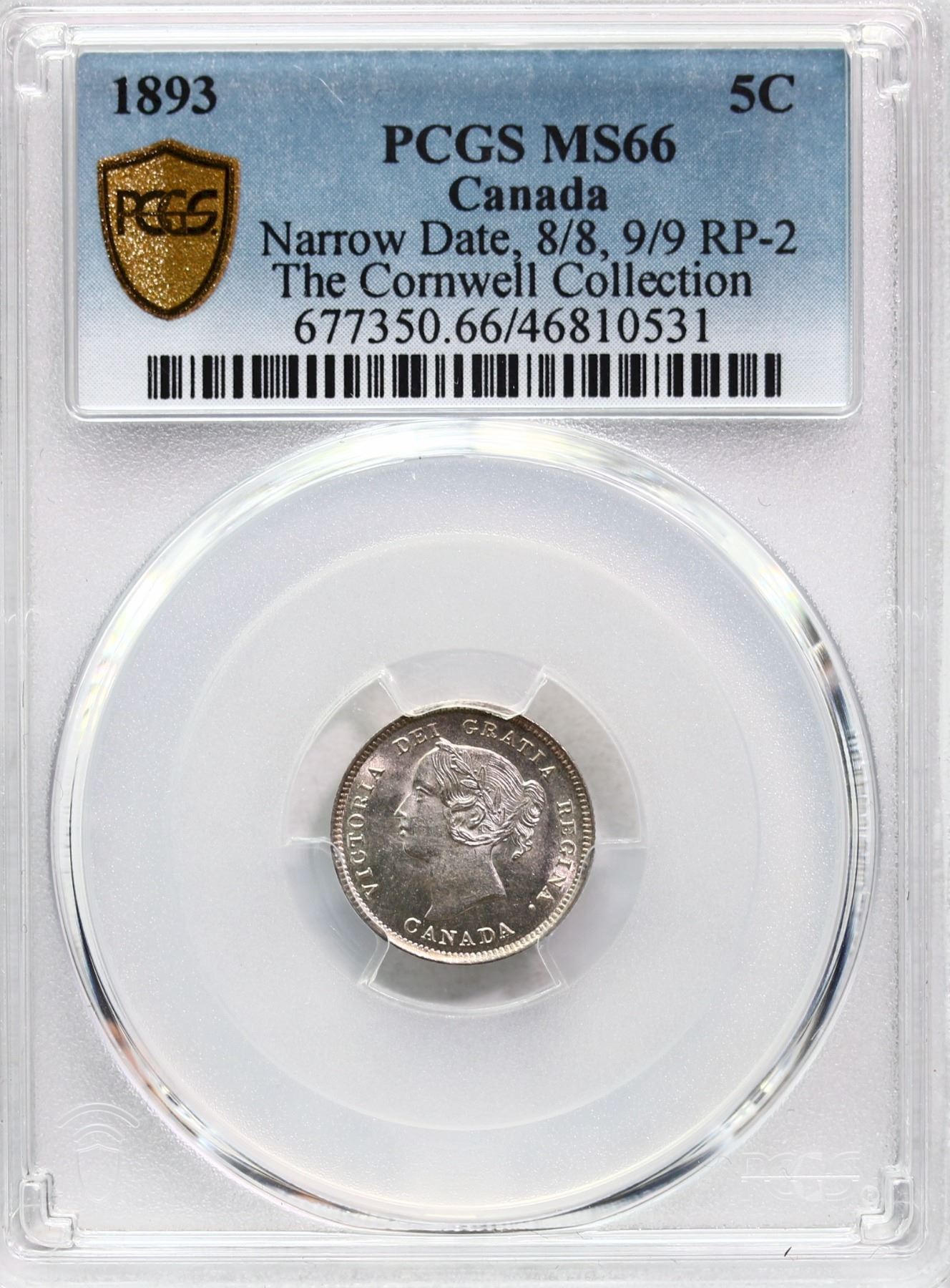 1893 5¢ "8/8, 9/9 - RP2 PCGS Superb Gem Mint State-66 Superb eye appeal with strong Cameo contrast. Very flashy and desirable. A superior example. Ex. Cornwell.