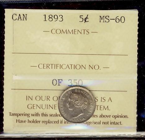 1893 5¢ ICCS MS60, nice with attractive toning.