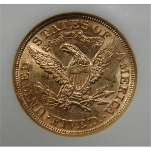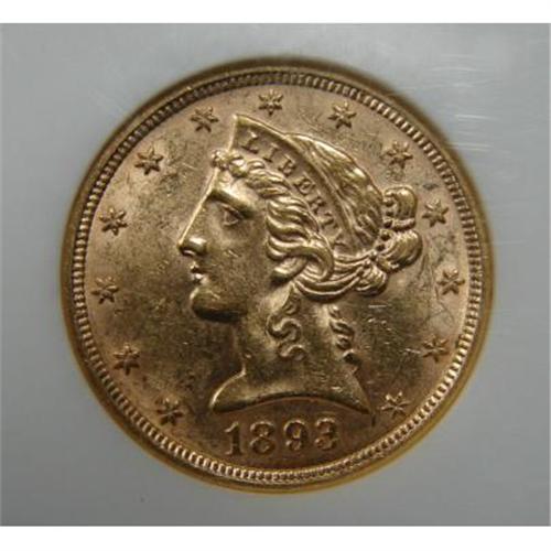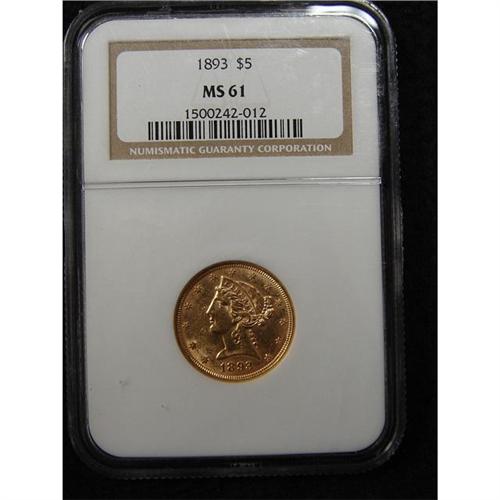 1893 $5 LIBERTY GOLD COIN. MS 61. Graded by NGC.