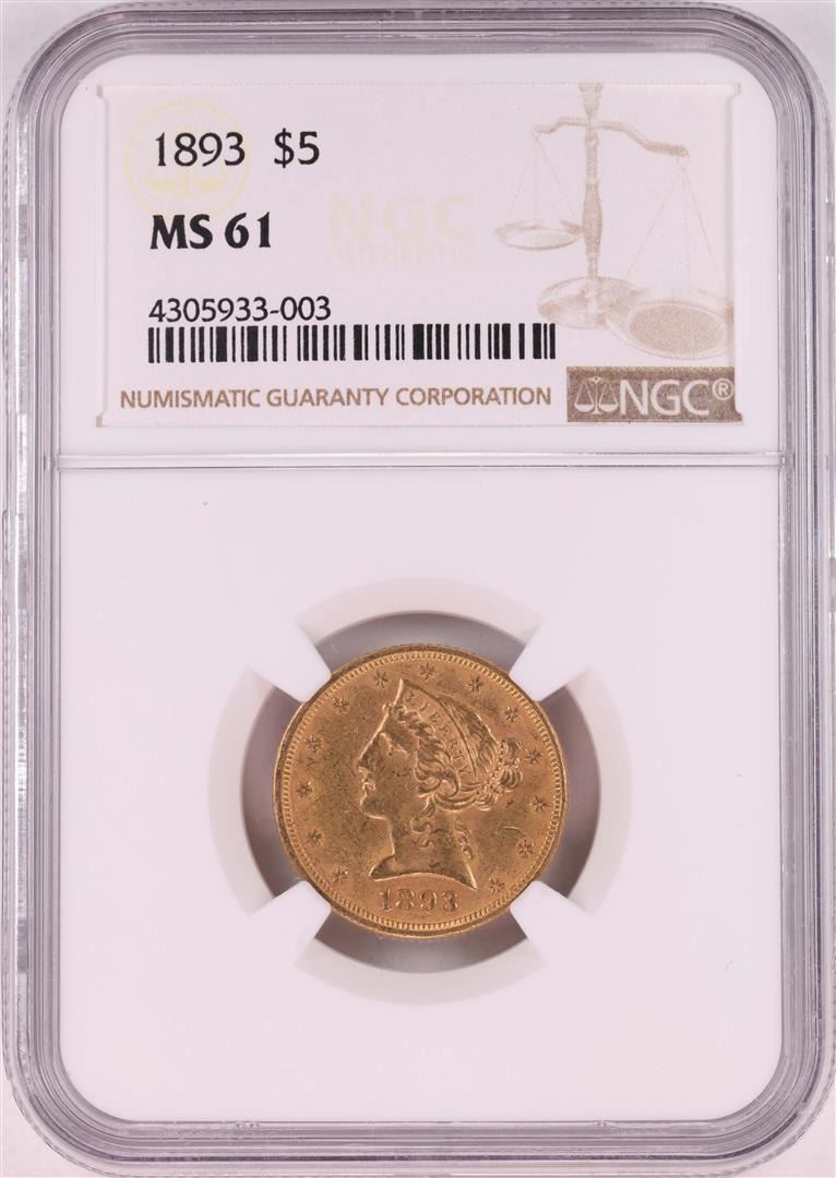One 1893 $5 Liberty Head Half Eagle Coin NGC MS61. NGC Certified.