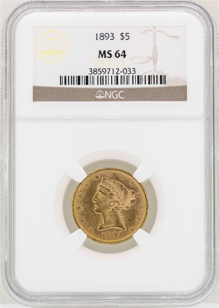 One 1893 $5 Liberty Head Half Eagle Gold Coin NGC MS64. NGC Certified.