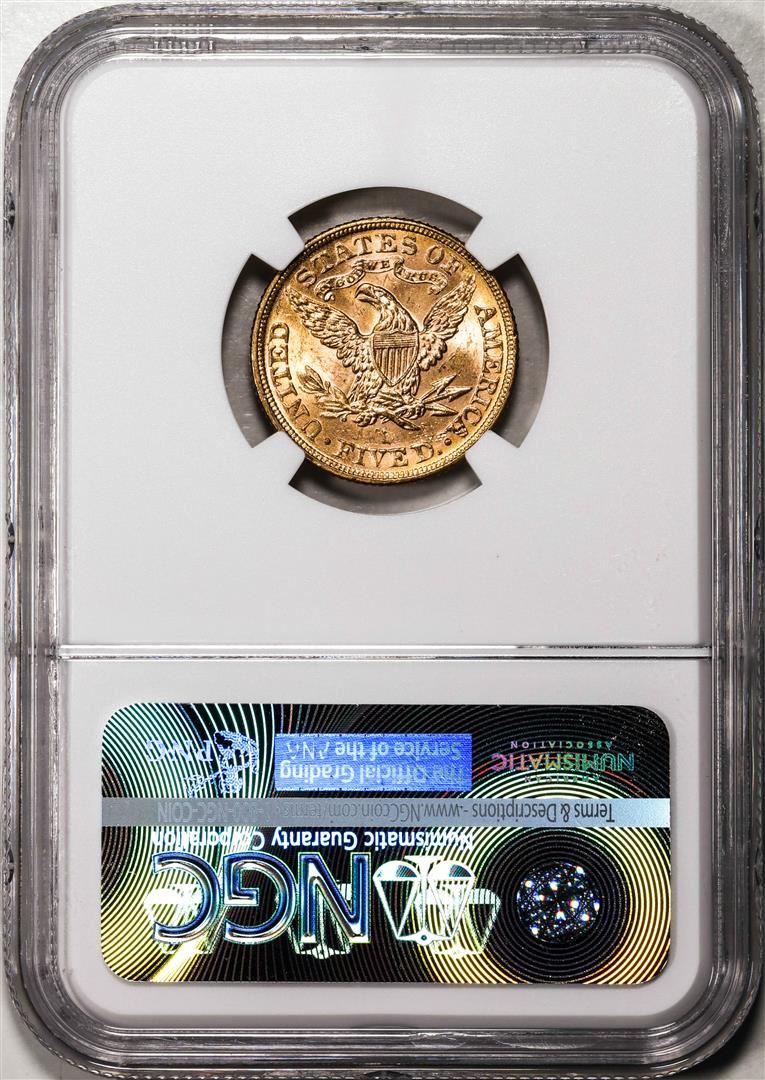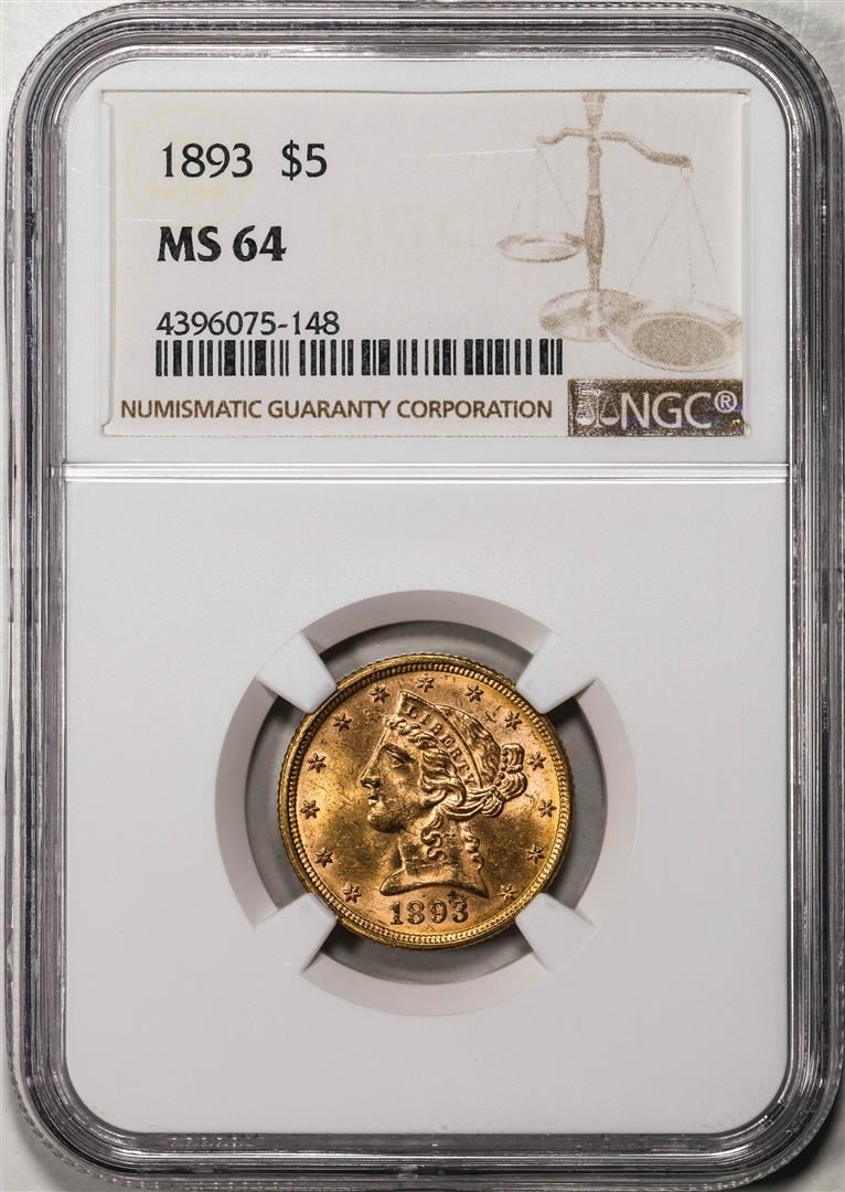 One 1893 $5 Liberty Head Half Eagle Gold Coin NGC MS64. NGC Certified.