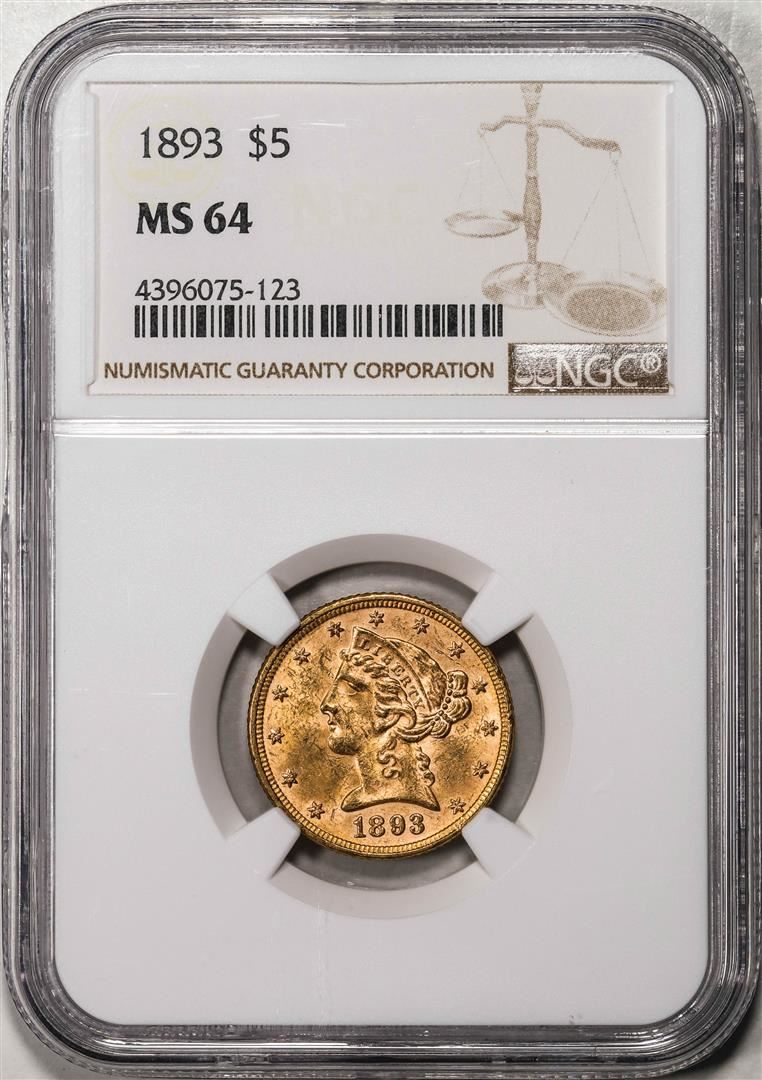 One 1893 $5 Liberty Head Half Eagle Gold Coin NGC MS64. NGC Certified.