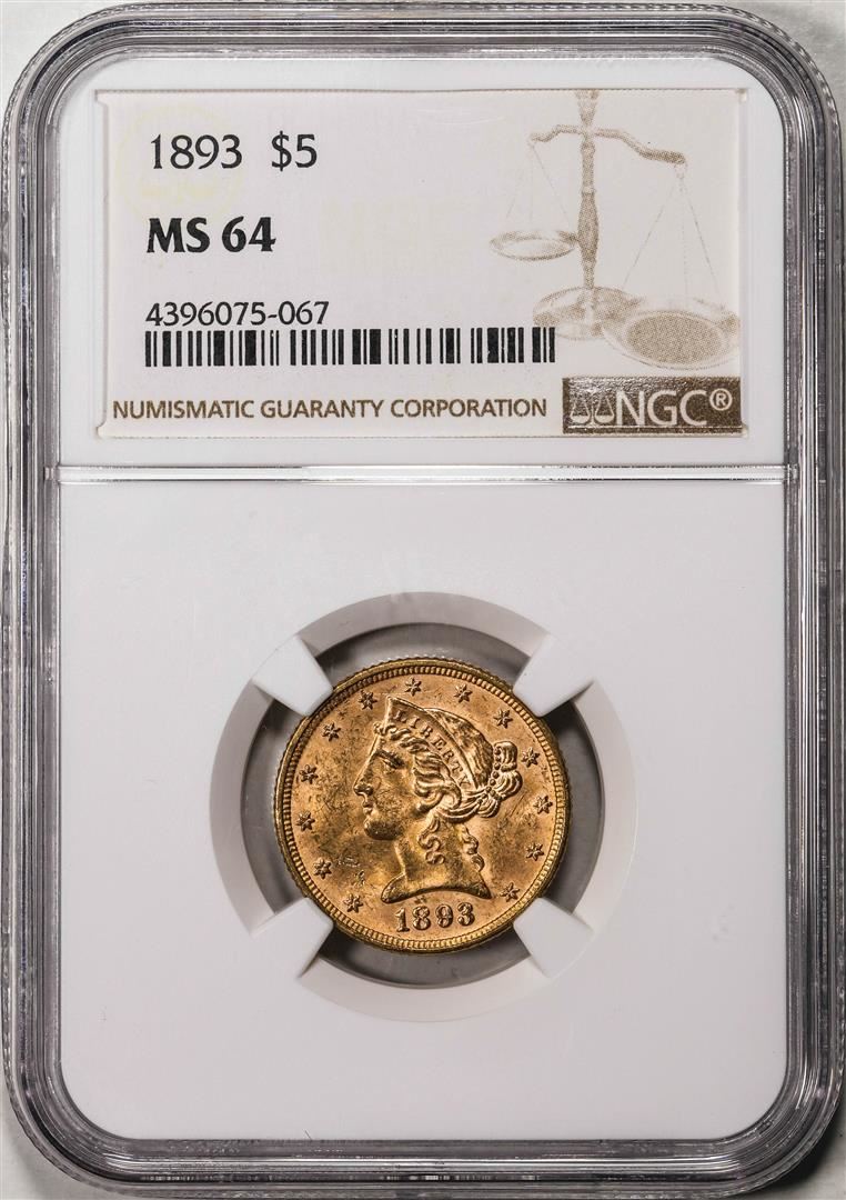 One 1893 $5 Liberty Head Half Eagle Gold Coin NGC MS64. NGC Certified.
