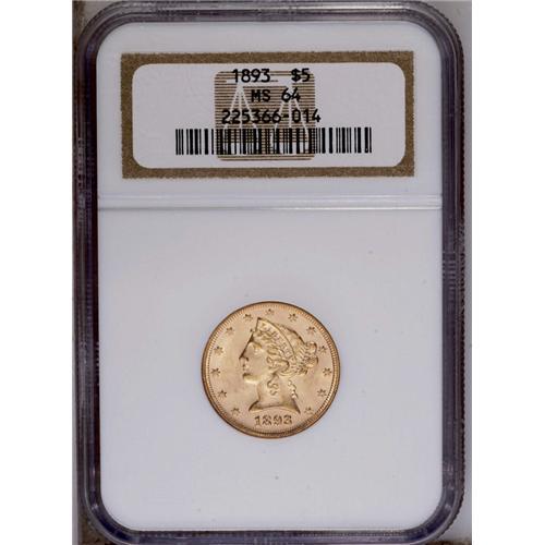 <B>1893<$5> MS64 NGC.</B></I> A nicely struck and attractive Choice Liberty half eagle that lacks obvious marks. A similar piece would have funded a family trip to Chicago's Columbian Exposition in 1893.