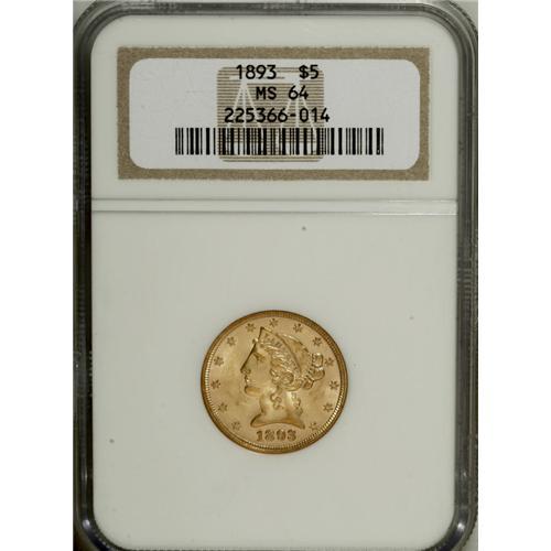 <B>1893 $5 MS64 NGC.</B></I> A nicely struck and attractive Choice Liberty half eagle that lacks obtrusive marks. A similar piece would have funded a family trip to Chicago's Columbian Exposition in 1893.<BR><BR><b>Shipping:</b> Coins & Currency (<a target="_blank" href="http://www.heritageauctions.com/common/shipping.php">view shipping information</a>)
