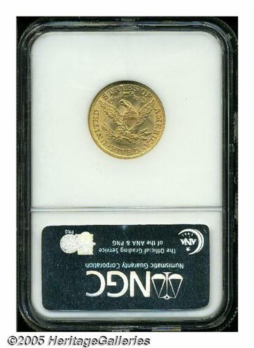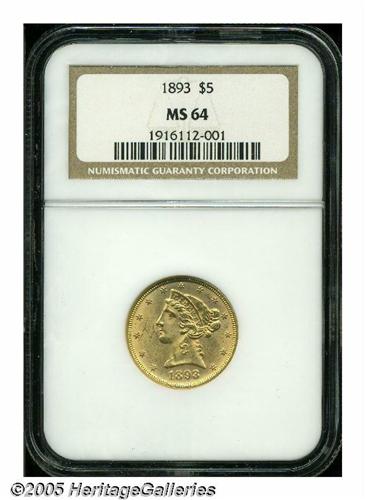 <B>1893<$5> MS64 NGC.</B></I> Yellow-gold surfaces display soft luster, and the design elements are well struck throughout. Several light to moderate contact marks are noted on Liberty's cheek and in the left (facing) obverse field, with some lighter ones in the right (facing) obverse and reverse fields.
