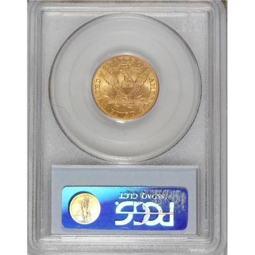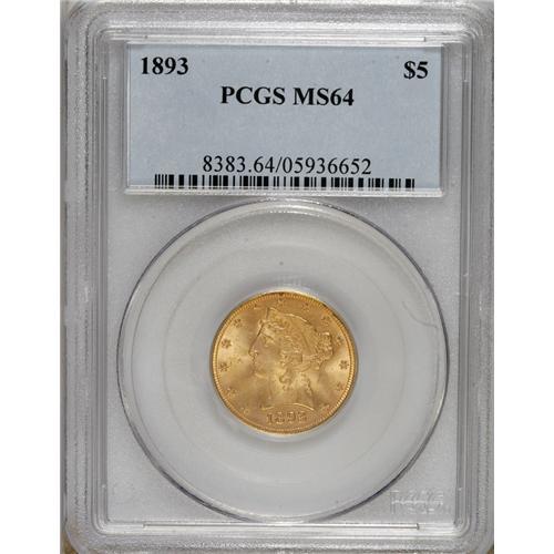 <B>1893 $5 MS64 PCGS.</B></I> A sharp strike and frosty yellow luster are evident on both sides of this piece. It is a delightful near-Gem with exceptional eye appeal. In finer Gem grades, this date is rare with only 24 finer examples certified by PCGS (4/07).<BR><BR><b>Shipping:</b> Coins & Currency (<a target="_blank" href="http://www.heritageauctions.com/common/shipping.php">view shipping information</a>)