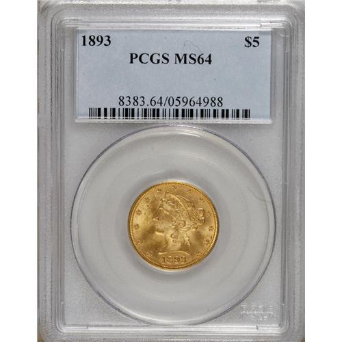 <B>1893 $5 MS64 PCGS.</B></I> A well-defined and slightly satiny Choice example of this later Liberty issue. One small copper spot appears to the left of Liberty's nose, and a single abrasion is present on the chin.<BR><BR><b>Shipping:</b> Coins & Currency (<a target="_blank" href="http://www.heritageauctions.com/common/shipping.php">view shipping information</a>)