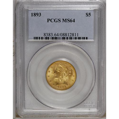 1893 $5 MS64 PCGS. Solidly struck with frosty luster.