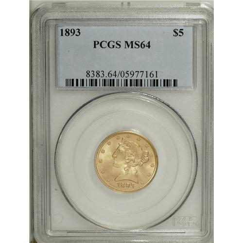 <B>1893 $5 MS64 PCGS.</B></I> The frosty wheat-gold surfaces of this near-Gem have an aura of originality. Crisply struck with few flaws on the obverse, though light abrasions are present near the eagle's head.<BR><BR><b>Shipping:</b> Coins & Currency (<a target="_blank" href="http://www.heritageauctions.com/common/shipping.php">view shipping information</a>)