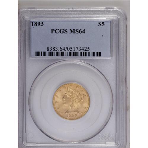 <B>1893<$5> MS64 PCGS.</B></I> Yellow-orange with subtle hints of peach on the highpoints. Generally well struck, though the central devices show slight weakness, with marks appropriate for the grade.