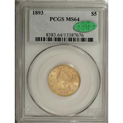<B>1893 $5 MS64 PCGS. CAC.</B></I> This boldly impressed yellow-gold piece shows satiny surfaces. Faint obverse grazes are only visible beneath a glass, and the reverse is beautifully preserved. PCGS has graded 25 finer pieces.<BR><BR><B>Coin Engraver:</B> Christian Gobrecht<BR><BR><b>Shipping:</b> Coins & Currency (<a target="_blank" href="http://www.heritageauctions.com/common/shipping.php">view shipping information</a>)