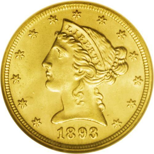 <B>1893<$5> MS65 NGC.</B></I> Appealing khaki-gold surfaces boast a boldly detailed strike and a near-total absence of distracting ticks. A couple of tiny dark toning spots are noted on the reverse, but the eye appeal is superb. NGC has graded only eight finer pieces of this issue (9/06).
