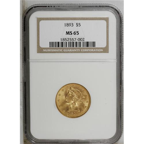 1893 $5 MS65 NGC. Appealing khaki-gold surfaces boast