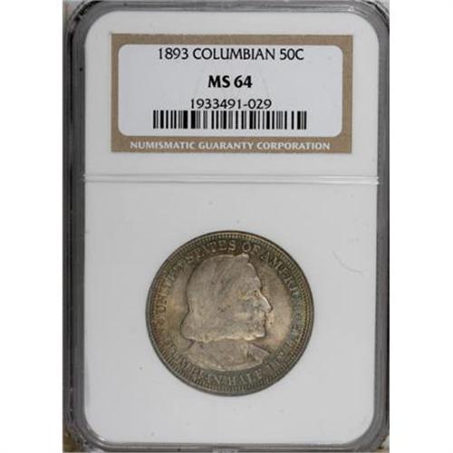 <B>1893 50C Columbian MS64 NGC.</B></I> NGC Census: (1703/766). PCGS Population (1218/555). Mintage: 1,550,405. Numismedia Wsl. Price for NGC/PCGS coin in MS64: $160. (#9297)<BR><BR><b>Shipping:</b> Coins & Currency (<a target="_blank" href="http://www.heritageauctions.com/common/shipping.php">view shipping information</a>\)