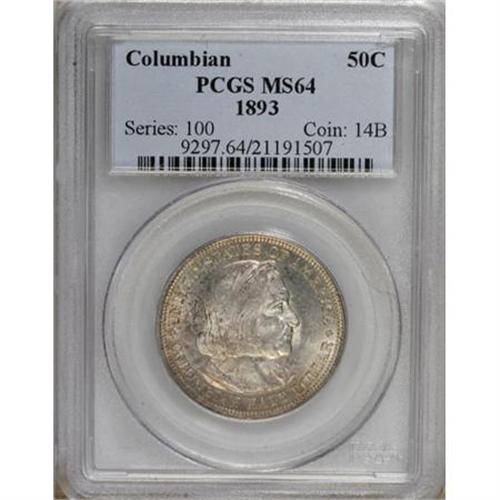 <B>1893 50C Columbian MS64 PCGS.</B></I> PCGS Population (1218/555). NGC Census: (1703/766). Mintage: 1,550,405. Numismedia Wsl. Price for NGC/PCGS coin in MS64: $160. (#9297)<BR><BR><b>Shipping:</b> Coins & Currency (<a target="_blank" href="http://www.heritageauctions.com/common/shipping.php">view shipping information</a>\)