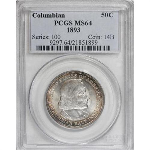 <B>1893 50C Columbian MS64 PCGS.</B></I> PCGS Population (1218/555). NGC Census: (1703/766). Mintage: 1,550,405. Numismedia Wsl. Price for NGC/PCGS coin in MS64: $160. (#9297)<BR><BR><b>Shipping:</b> Coins & Currency (<a target="_blank" href="http://www.heritageauctions.com/common/shipping.php">view shipping information</a>\)