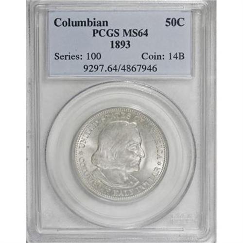 <B>1893 50C Columbian MS64 PCGS.</B></I> PCGS Population (1245/585). NGC Census: (1727/781). Mintage: 1,550,405. Numismedia Wsl. Price for NGC/PCGS coin in MS64: $160. (#9297)<BR><BR><b>Shipping:</b> Coins & Currency (<a target="_blank" href="http://www.heritageauctions.com/common/shipping.php">view shipping information</a>)