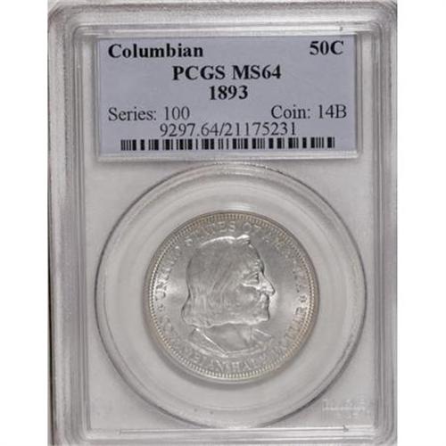 <B>1893 50C Columbian MS64 PCGS.</B></I> PCGS Population (1254/595). NGC Census: (1733/786). Mintage: 1,550,405. Numismedia Wsl. Price for NGC/PCGS coin in MS64: $160. (#9297)<BR><BR><b>Shipping:</b> Coins & Currency (<a target="_blank" href="http://www.heritageauctions.com/common/shipping.php">view shipping information</a>)