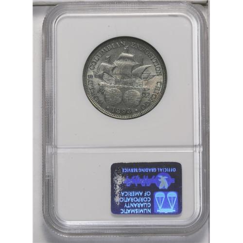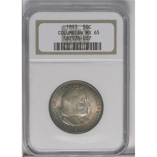 <B>1893<50C> Columbian MS65 NGC.</B></I> This Gem quality Columbian half dollar screams with luster on both sides. The obverse has ivory color at the centers, gradually giving way to Venetian-red, sea-green, and pale lilac toning. The reverse has nicely distributed gunmetal-blue color.