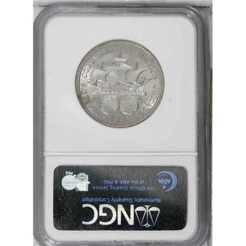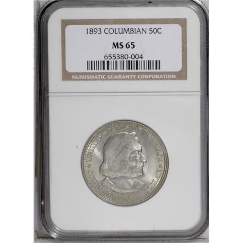 <B>1893<50C> Columbian MS65 NGC.</B></I> While more Columbians were made in 1893 than in 1892, the later date is less common in Gem condition. This lustrous and sharply struck example has slight iridescence.