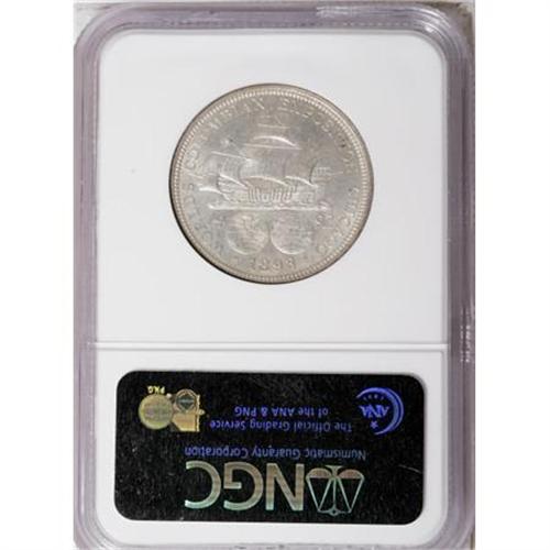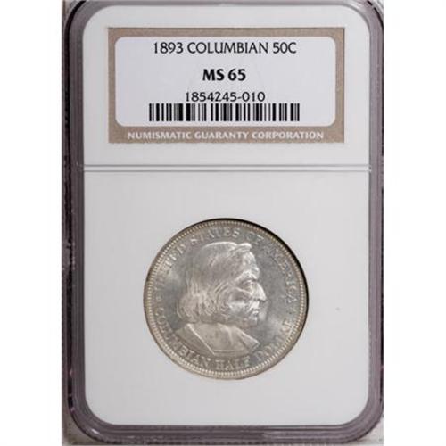 <B>1893 50C Columbian MS65 NGC.</B></I> Accompanying the lot are four different fascinating pictorial books on the 1893 Columbian Exposition, and a 1904 Louisiana Purchase Exposition pictorial book. The books average VG to Fine. NGC Census: (605/161). PCGS Population (412/143). Mintage: 1,550,405. Numismedia Wsl. Price for NGC/PCGS coin in MS65: $765. (#9297)<BR><I>From The Frank DuVall Collection of U.S. Commemoratives.</B></I><BR><BR><b>Shipping:</b> Coins & Currency (<a target="_blank" href="http://www.heritageauctions.com/common/shipping.php">view shipping information</a>\)