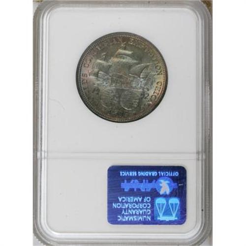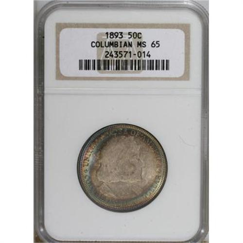<B>1893 50C Columbian MS65 NGC.</B></I> Exquisitely toned in bands of aquamarine, butter-gold, ruby-red, and powder-blue. Nicely struck and moderately abraded. The reverse has prominent cartwheel sheen.<BR><BR><b>Shipping:</b> Coins & Currency (<a target="_blank" href="http://www.heritageauctions.com/common/shipping.php">view shipping information</a>)
