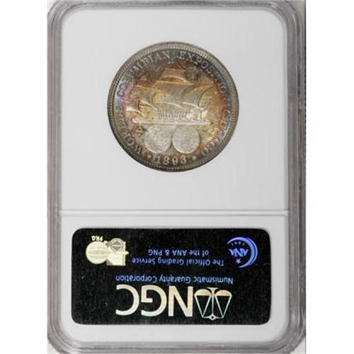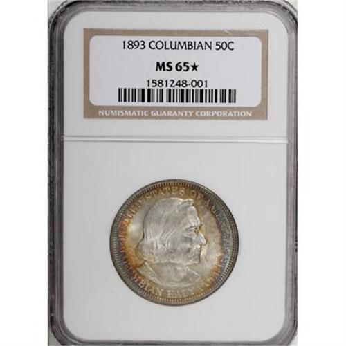 <B>1893 50C Columbian MS65 <img src="/images/star.gif" width="10" height="10" alt="" border="0"> NGC.</B></I> This is a gorgeous Gem that carries the additional NGC star designation for good reason. The surfaces have brilliant mint frost that exhibits peripheral gold, blue, and lilac toning on each side.<BR><BR><b>Shipping:</b> Coins & Currency (<a target="_blank" href="http://www.heritageauctions.com/common/shipping.php">view shipping information</a>)