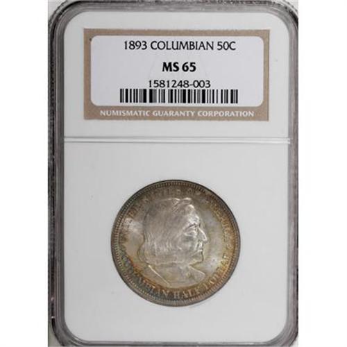 <B>1893 50C Columbian MS65 NGC.</B></I> A lovely Gem with frosty luster and central brilliance on each side. The borders have lovely gold, blue, and iridescent toning.<BR><BR><b>Shipping:</b> Coins & Currency (<a target="_blank" href="http://www.heritageauctions.com/common/shipping.php">view shipping information</a>)