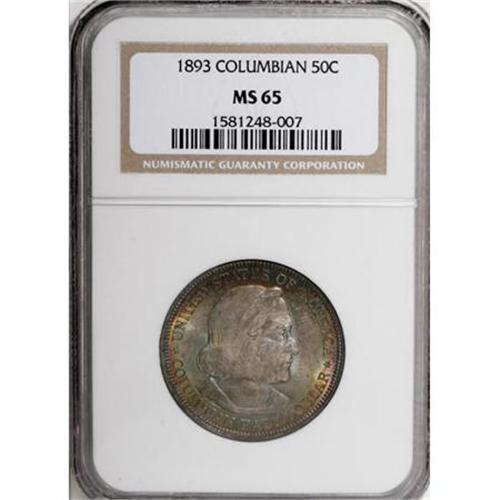 <B>1893 50C Columbian MS65 NGC.</B></I> Perhaps the end piece from an original roll, this Gem has deep sea-green, gold, and iridescent toning on the obverse, with brilliant reverse luster accented by peripheral gold and vibrant blue.<BR><BR><b>Shipping:</b> Coins & Currency (<a target="_blank" href="http://www.heritageauctions.com/common/shipping.php">view shipping information</a>)