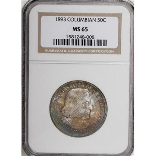 <B>1893 50C Columbian MS65 NGC.</B></I> A lovely piece that has intermingled gold, lilac, and sky blue on the obverse with gold and sea-green on the reverse.<BR><BR><b>Shipping:</b> Coins & Currency (<a target="_blank" href="http://www.heritageauctions.com/common/shipping.php">view shipping information</a>)